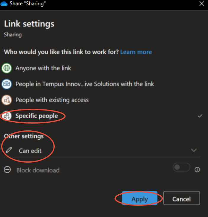 Whilst on this page, you can also set if the share is for view or edit access. Once these settings are correct, select apply.